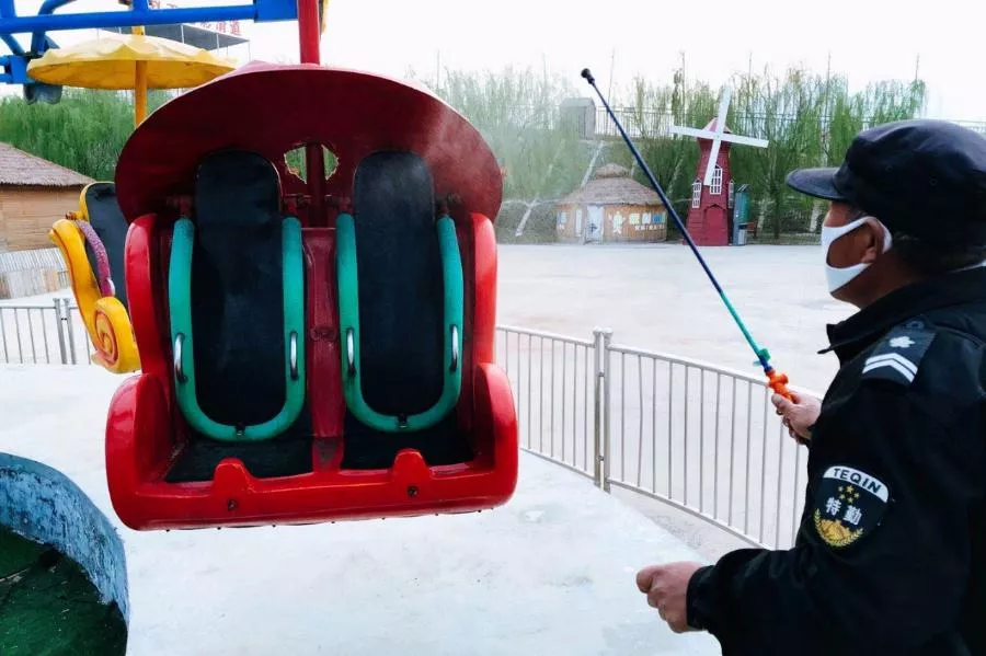 工作人員對景區(qū)游樂設(shè)施進(jìn)行消毒工作