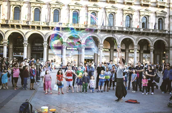 米蘭人非常尊重藝術(shù),對(duì)他們也報(bào)以極大的尊重,從他們對(duì)待街頭藝人的態(tài)度就可見一斑。當(dāng)我路過運(yùn)河邊時(shí),突然聽到大提琴調(diào)音的聲音。循聲聽去,在這個(gè)無比悶熱的天氣里,兩個(gè)音樂學(xué)院留學(xué)生的大小提琴合奏喚醒了所有人的靈魂。這對(duì)音樂學(xué)院的留學(xué)生組合是一個(gè)胖子和一個(gè)瘦子。瘦子頂著一頭小卷毛,下頜夾著一把小提琴,手托著琴把。那一根根弦發(fā)出的聲音時(shí)而輕描淡寫,柔美地讓人發(fā)顫,時(shí)而高亢激昂。但當(dāng)碰撞上小胖哥低沉的大提琴時(shí),這兩股結(jié)合在一起變得更為通透的聲音像在和運(yùn)河對(duì)話著,那是一種多么奇妙的旅程。