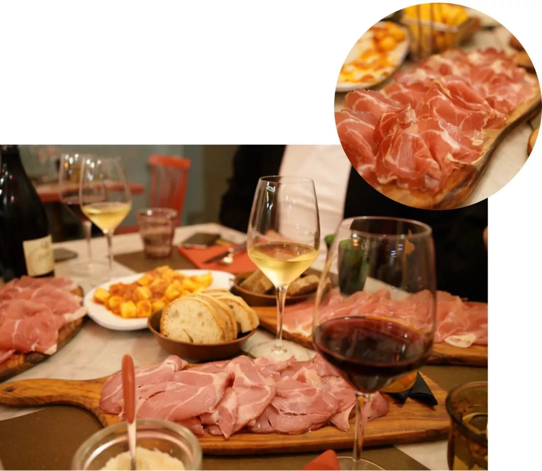 選了一家當(dāng)?shù)匾獯罄笥淹扑]的知名火腿店吃晚餐,餐廳的名字是DEGUSTERIA ROMANI,這里有火腿最正確的打開方式,我們點(diǎn)了多個(gè)部位的火腿,那種馥郁芳香在口腔中彌漫的感覺,非常上頭。