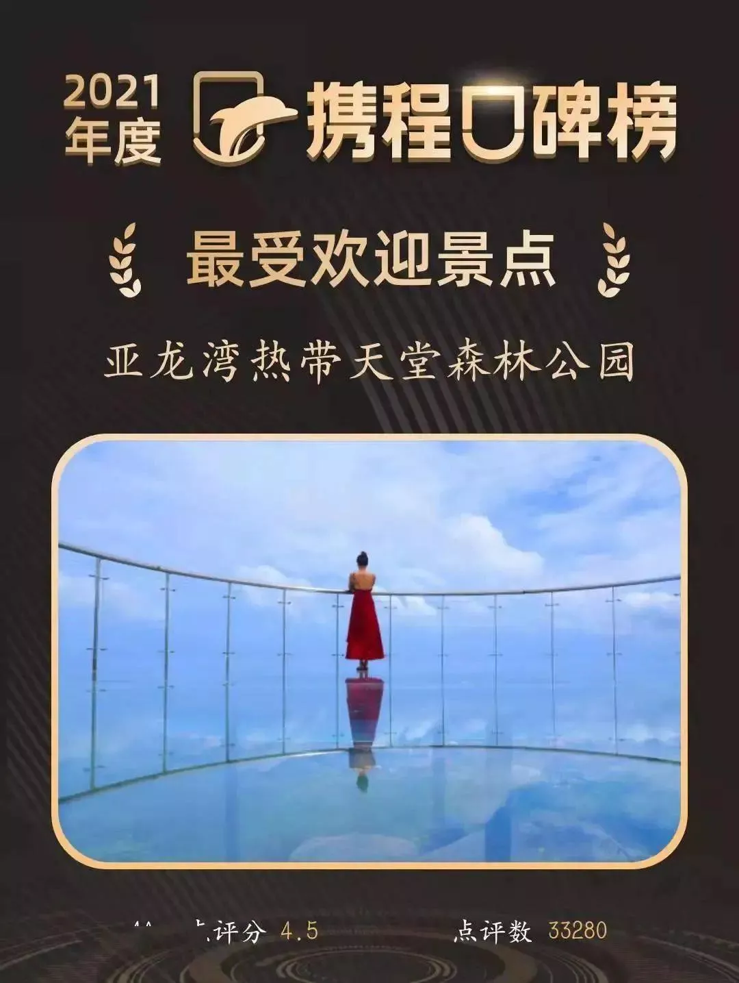亞龍灣熱帶天堂森林公園亞龍灣蝴蝶谷亞龍灣貝殼館亞龍灣中心廣場(chǎng)亞龍灣鳥(niǎo)巢度假村亞龍灣海底世界亞龍灣熱帶天堂森林公園榮獲“2021年度攜程口碑榜最受歡迎景點(diǎn)”