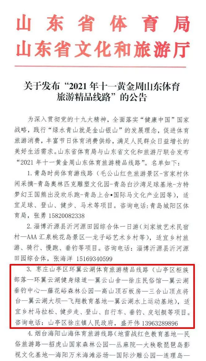 山亭區(qū)環(huán)翼云湖旅游線路入選2021年“十一黃金周山東體育旅游精品線路”