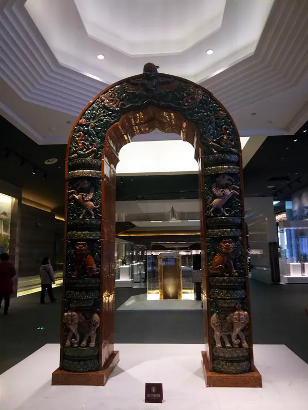 展廳中那座最?yuàn)Z目的拱門,就是復(fù)制的大報(bào)恩寺琉璃塔拱門。因?yàn)椤秶?guó)家寶藏》地?zé)岵?,它已?jīng)成為最近南京的網(wǎng)紅。陳列在南京博物館的是由出土的琉璃構(gòu)建重新組裝復(fù)原的琉璃拱門,而這件則是復(fù)制品。