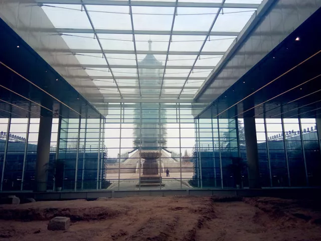 走進(jìn)廳內(nèi),迎面是透明的玻璃墻體設(shè)計(jì),外面是中軸線上復(fù)建的大報(bào)恩塔,室內(nèi)是天王殿的遺址區(qū)。