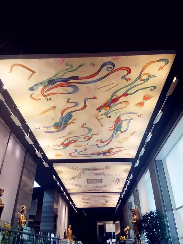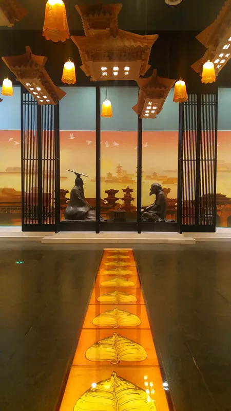沿著遺址區(qū)左邊前行,巨大的屏幕細(xì)述著大報(bào)恩寺的前世故事。另一側(cè)是玄奘法師與佛陀的千年對(duì)望,走上臺(tái)階,腳踩步道,步步生蓮。
