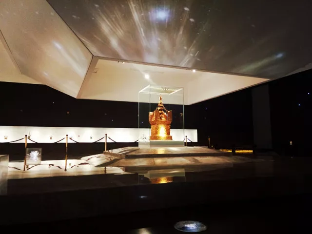 地宮陳列區(qū)陳列著地宮出土的諸多佛教圣物:石函、鐵函和國(guó)寶級(jí)文物七寶鎏金阿育王塔等。