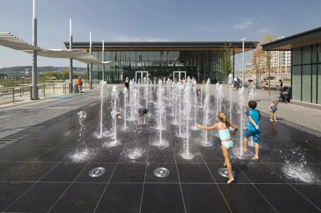 The park includes several interactive water features, a performance stage, a sculpture play area, a pavilion, bench swings, water gardens, and Cinergy Trace, a 1000-foot-long riverfront promenade. Public landings and seasonal docking and wharves service the public and commercial cruise boat traffic.