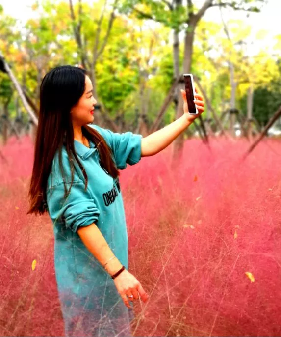 一位女青年在粉黛亂子草旁拍照留念