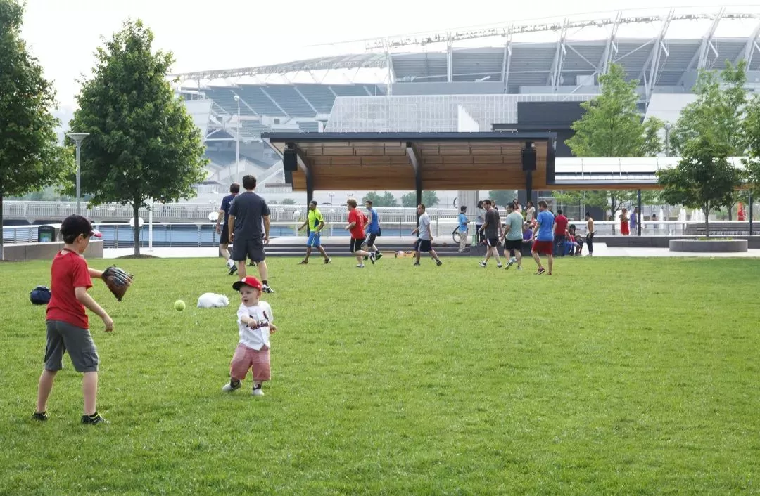 公園包括好幾處互動(dòng)水景、一個(gè)演出舞臺(tái)、雕塑游樂區(qū)、亭臺(tái)、板凳秋千、水花園以及辛娜吉步道,一個(gè)300米長的濱河散步道。公共與季節(jié)性碼頭服務(wù)大眾以及各類商業(yè)游艇。