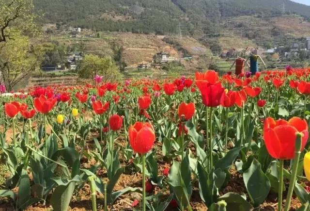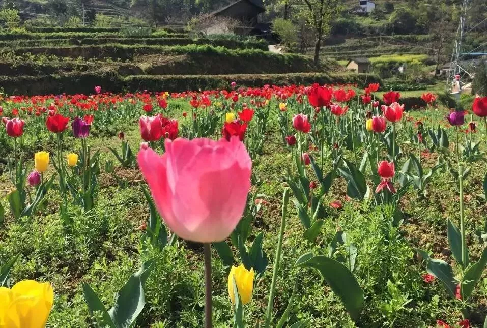 高貴的郁金香、嬌艷的桃花、清雅的波斯菊、高潔的梨花......、從路邊一直到門前,從田野一直到山包,每一處都點綴著不同的花朵。微風(fēng)拂過,花兒迎風(fēng)招展,一派春的景象。