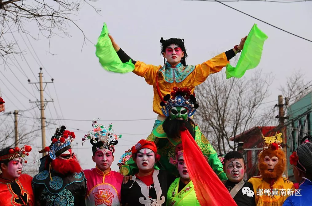 正月十四至正月十六,馬頭鎮(zhèn)主要干道上,一隊(duì)隊(duì)高蹺者,在大鼓、小鐋鑼、大小釵的打擊樂(lè)中穿街而過(guò)。高蹺的隊(duì)列在街頭行進(jìn)中,一般采用一字長(zhǎng)蛇陣的單列,時(shí)而在繁華地段采用雙人并列隊(duì)形,步子變換為八字步伐,甚至在表演時(shí)還做著小旋風(fēng)、花膀子、鷂子翻身、大劈叉等高難度危險(xiǎn)動(dòng)作,配合著翩翩起舞的扇子秧歌,好似把人帶入了一種云海仙境。這就是來(lái)自馬頭鎮(zhèn)橋東村的高蹺表演者,他們身著傳統(tǒng)戲裝打扮,由開(kāi)路棍打頭兒,隨之便出現(xiàn)孫悟空、豬八戒、白蛇、芝麻官、丑婆、姜子牙等藝術(shù)形象,他們?cè)溨C有趣、粗獷喜人、聲情并茂、時(shí)有樂(lè)哏,為人們帶來(lái)了濃厚的節(jié)日味道。