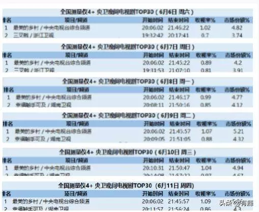 從數(shù)據(jù)統(tǒng)計(jì)來看,除了6月6日首播當(dāng)天未能拿下收視冠軍,《最美的鄉(xiāng)村》從6月7日開始到14日連續(xù)拿下9個(gè)衛(wèi)視收視冠軍,而《三叉戟》《燃燒》對(duì)于未能達(dá)成這一成就。