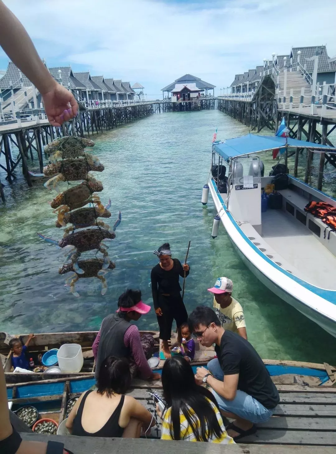 上午和下午又浮潛了一次,其余時(shí)間躺在門前的躺椅發(fā)呆,不時(shí)有小船在木屋下穿梭,有時(shí)是幾個(gè)小朋友,最小的看起來像剛會(huì)走路,有時(shí)是幾個(gè)大個(gè)在兜售海鮮,我們買了一些蝦蟹讓餐廳加工,價(jià)格非常便宜,可惜餐廳加工味道一般。