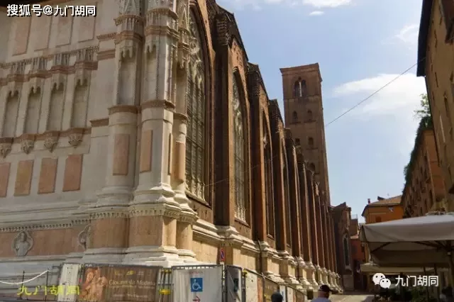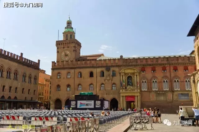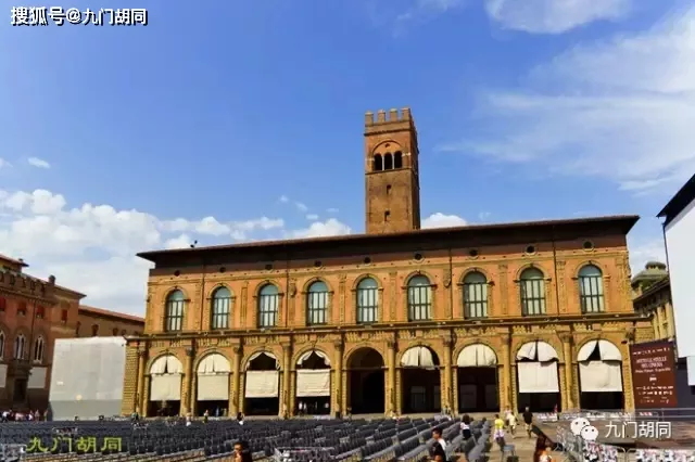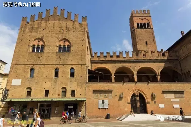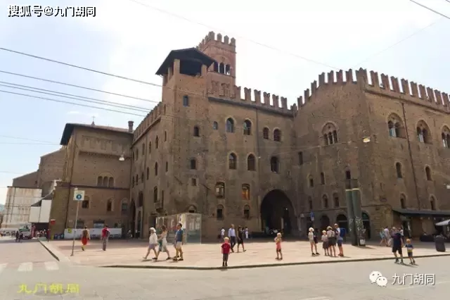 廣場上正對教堂的波德斯塔宮(Palazzo del Podestà),建于1200年前后,Podestà有總督的意思,也即神圣羅馬帝國皇帝派駐在博洛尼亞的行政長官。
