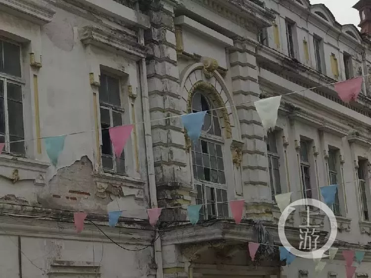 記者現(xiàn)場看到,這棟建筑的骨架還在,但被歲月洗劫得不成樣子了。側(cè)面墻上有一處明顯鼓起,可見墻體膨脹得厲害??拷箝T口的八角形門廳已被磚頭封死。二樓拱形窗戶的窗框不知去向,只剩下一個窗口。樓頂也有年久破損的痕跡。