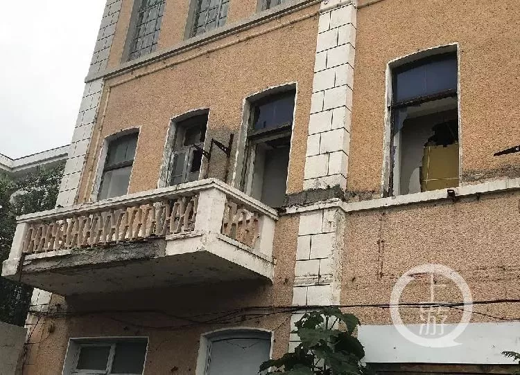 記者現(xiàn)場(chǎng)看到,這棟建筑的骨架還在,但被歲月洗劫得不成樣子了。側(cè)面墻上有一處明顯鼓起,可見墻體膨脹得厲害??拷箝T口的八角形門廳已被磚頭封死。二樓拱形窗戶的窗框不知去向,只剩下一個(gè)窗口。樓頂也有年久破損的痕跡。