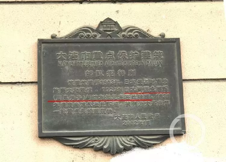 門口“大連市重點保護建筑”牌子,介紹了這棟建筑的歷史及舊貌:“該建筑建于1903年,日本侵占時期為旅順大和旅館。1927年日本間諜金碧輝(川島芳子)與蒙古王爺之子甘布爾扎布在此結(jié)婚。1931年清廢帝溥儀在此下榻。被列為大連市第一批重點保護建筑物?!?/p>