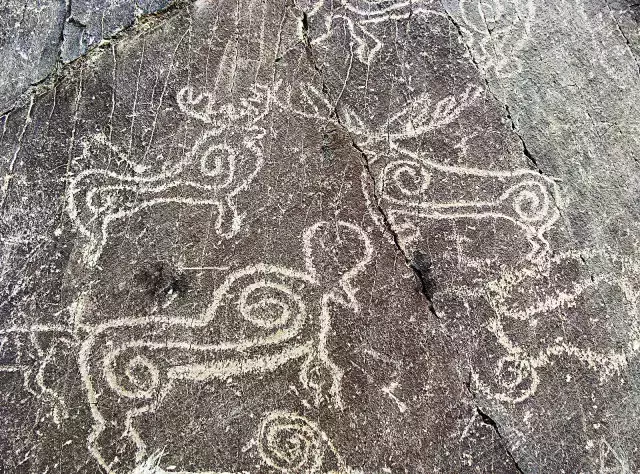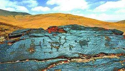 日土巖畫班公湖湖盆南部東部近兩、三百平方公里的面積內,分布有魯日朗卡、阿壟溝、那布龍、塔康巴、布顯、康巴熱久、日姆棟、過巴、曲嘎爾羌等13處巖畫點。這些巖畫圖像均用敲琢法完成,大致屬于吐蕃時期之前的早期金屬時代。