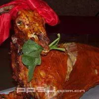 “烤全羊”是內(nèi)蒙古一種傳統(tǒng)而具有獨(dú)特風(fēng)味的宴客佳肴。由于“烤全羊”的加工方法特殊和講究,以前只供蒙古王爺享用,一般牧民根本吃不到,如今這一傳統(tǒng)美食一般人都有機(jī)會(huì)品嘗了。 烤全羊之所以名聞遐邇,除了因?yàn)檫x用的羊肉質(zhì)好以外,關(guān)鍵在于它有一整套特殊的烤制方法??狙蛞x擇膘肥體壯的四齒三歲綿羊作原料,屠宰時(shí)必須采用攥心法:從羊的胸部開刀,把手伸入羊腔,攥捏其心臟致死,用這種方法殺死的羊不會(huì)大量出血,其肉格外可口。羊宰殺后不用剝皮,先把前腿掛起開膛,取掉五臟和下水,洗凈胸腔、腹腔,然后用開水燙去羊毛,以堿水洗凈全身羊皮。在羊的胸腔內(nèi)放入各種佐料,四肢向上,羊背朝下,用鐵鏈反吊起來,放入爐內(nèi)烘烤??緺t是特制專用的,以磚砌成,形成穹廬,先用一種叫梭梭的柴禾,將爐內(nèi)燒紅,撤去燃料,將全羊從烤爐的天窗口吊入,并關(guān)閉天窗和爐門,借用爐內(nèi)高溫,將羊肉炯至半熟,再打開爐門,由廚師用長柄勺,舀上梭梭柴的火塊,對(duì)著羊身進(jìn)行烤炙,直到羊全身烤成焦黃色為止。用這種慢火烤炙,能使羊腹中的佐料味逐漸滲透于羊肉之內(nèi),同時(shí)能使羊肉熟透。