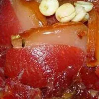 蜜汁火方,是上海、江蘇和浙江地區(qū)的傳統(tǒng)名菜。最早聞名于江浙兩地。上海從清末開始,首見于蘇州風(fēng)味和揚(yáng)州風(fēng)味菜館經(jīng)營此菜,頗受吃客青睞。如今,以滬上老半齋酒樓和揚(yáng)州飯店烹制的為佳,馳名中外。凡品嘗過此菜的中外食者,無不贊賞。50年代末,毛澤東主席來上海視察工作時(shí),上海大廈曾邀請(qǐng)莫有庚和莫有財(cái)?shù)热值芘胫啤懊壑鸱健保飨穱L后,非常滿意,跟隨毛主席的工作人員,還特地找莫氏兄弟詢問具體的制作方法。近幾年來外國來賓在該店品嘗了“蜜汁火方”,也稱贊其:“菜式新穎,花樣逼真,調(diào)味佳美,不愧為古國精美藝術(shù)?!?蜜汁火方用火腿上方煮、煨而成。成菜色澤火紅,鹵汁透明,火腿酥爛,滋味鮮甜,深有回味。其具體做法是將火腿上方的凈精肉一整塊洗凈。入湯鍋煮,至八成酥取出,除去筒骨,有盆子壓平。冷卻后,入冰箱冰一下,取出,切成厚片(精肉仍然連在皮上)。砂鍋內(nèi)下火腿肉厚片、雞湯煨煮,拔去咸味,如味仍過咸,潷去原湯,另加清雞湯再拔咸味,至火腿肉厚片咸味拔凈,取出,放入另一鍋內(nèi),加清水50克、白糖200,用小火煨烤1小時(shí),至鹵汁稠濃,色澤光亮即成。