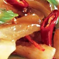 質(zhì)量標(biāo)準(zhǔn):玫瑰蹄筋形狀像肥雞腿,排骨色澤與寸香肉相同。咸淡適宜,有濃郁的玫瑰香味。出品率一般為61~62%。