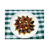 【原料】 鮮紅椒10克。 排骨500克,皮蛋250克。 植物油1000克(實(shí)耗50克),精鹽6克,味精5克,料酒20克,美極鮮醬油4克,阿香婆香辣醬8克,香蔥10克,姜、蒜籽各5克,整干椒10克,鮮湯500克。