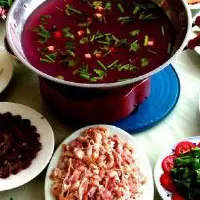岜夯雞火鍋,最重要的制作環(huán)節(jié)是酸湯要做得好。制作時(shí),首先把一種名叫“細(xì)葉芹”的野菜,摻入紅青菜中,用開(kāi)水燙過(guò),再加米湯泡三至五日,其湯即為有酸味的紅色湯汁。做岜夯雞多選用當(dāng)?shù)胤硼B(yǎng)的家雞,1.5公斤左右開(kāi)叫的公雞或即將下蛋的母雞最佳,宰后洗凈,剔出大的骨頭煮湯。將雞肉去骨切片或帶骨切為小塊,用姜汁、蔥汁、小粉、精鹽、醬油、燒酒等佐料拌勻浸透。再將青菜洗凈放入沸水中煮一會(huì)撈出,切成段。然后把準(zhǔn)備好的蒜苗、姜絲、胡椒、草果、辣子等十多種佐料入鍋,再倒入酸湯。