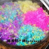 花米飯是布依人的專利品。將米飯染得色彩鮮艷、五彩斑讕,并由此賦予米飯無盡的詩情畫意和浪漫情調(diào),當(dāng)今世界,只有布依人才能做到。 花米飯的制作過程非常復(fù)雜。首先上好的糯米淘凈曬干,同時到山里采摘各種有利于身體的植物熬成紅、黃、藍(lán)、橙、黑等顏色,之后將洗凈的糯米分別浸泡于各類植物染料中,待各種鮮艷的色彩已深深浸透米質(zhì),米的顏色已徹底改變,再將它拿到水邊淘洗干凈,然后放到甄子里蒸熟。此時,滿甄子紅、黃、藍(lán)、橙、黑,鮮艷的色彩在濃濃蒸氣中熠熠閃爍,純粹的香味滿屋飄溢。面對如此色鮮味美的食物,即使你酒飽飯足,也禁不住要嘗上幾口。 千萬別擔(dān)心,布依人的五彩花飯絕對是真正的無公害綠色食品,所有色素全是植物熬制,非但對身體無害,內(nèi)中還含有大量的身體所需元素,你只管放心大膽地品嘗。如果未能如愿,請放心,五彩花飯已成功制成盒裝食品,你就大大方方買上幾盒,回家后再和老婆孩子、親朋好友慢慢品嘗。