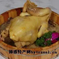 制作方法: 1.選料:選擇健康無(wú)病的、鮮活的雞為主料,以當(dāng)年仔雞為佳。 2.配鹵水:清水50千克,加花椒、桂皮、大料、草果各250克,陳皮、甘草各300克,丁香25克,白糖1.1千克,生抽2.2千克 食鹽1.05千克,將上述調(diào)料放紗布包內(nèi),放清水鍋內(nèi)煮1小時(shí)即為鹵水。 3.宰剖:將活雞宰殺,放凈血,入熱水內(nèi)浸燙,煺凈毛,再開(kāi)膛取出內(nèi)臟,沖洗干凈后,再將雞小腿窩入雞腹內(nèi)。 4.鹵制:將鹵水燒至微沸,把白條雞放鹵水內(nèi)浸燙,每隔10分鐘,倒出雞腹內(nèi)鹵水,再入鹵浸燙,直至雞熟為止(視雞腿肉松軟,用鐵扦扎無(wú)血水冒出即可)。 產(chǎn)品特點(diǎn):肉質(zhì)極嫩,鮮美可口。