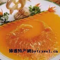 這是孔府高級宴席中的一個大菜。選用上等的白玉脊翅,經(jīng)過"度"燉、燒等精制加工,戲扒而成。成菜顏色紅潤光這,魚翅香爛味美。 原料: 發(fā)好的白玉脊翅1000克,冬筍50克,雞翅兩個,清湯1000克,料灑50克,蔥二段,姜二片,醬油40克,白糖20克,鹽水少許,濕淀粉15克,雞油5克,口蘑湯100克。 制法: 將魚翅用水氽過,加清湯(100克)、料酒(10克),加水(500克)燒開后放進魚翅"度"過。冬筍切蓑衣條,冬菇切大片。炒勺中倒入白油,燒至七成熱時,放入白糖,炒制呈雞血紅色時,烹入醬油(20克),加清湯(100克)、料酒(10克)、蔥、姜,燒沸后撇去浮沫,倒入洗凈的砂鍋內(nèi)。 砂鍋底排上豬肋骨、雞架骨、火腿腳、魚翅用白凈沙布包成一個扁包,放在雞骨架上,上面放豬肉片和雞翅,加入清湯(750克)、醬油、料酒、鹽水、放旺火上燒開5分鐘后,移到慢火上燉1小時、約八成熟時、加入口蘑湯,再燉半小時到爛。 取出魚翅包,放在海碗中,開包把魚翅擺整齊,扣到直徑40厘米的大平盤中。燉魚翅用的原料另作別用。炒勺內(nèi)加入少量燉魚翅的紅湯,再加清湯(50克)、鹽水少許、表清水(50克)燒開后撇去浮沫,用濕淀粉提芡,淋入雞油,摟勻后,澆到魚翅上。