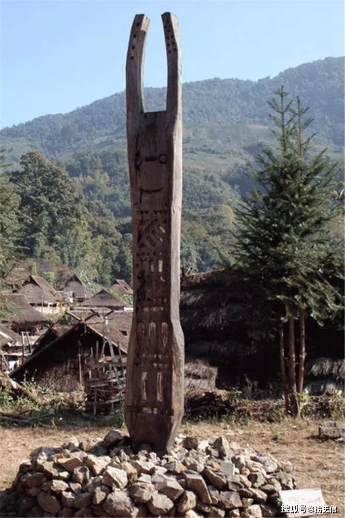 寨樁是佤家的一種圖騰崇拜,一般位于寨中央的打歌場(chǎng),代表著有人類在這里繁衍生息,最高的那桿是用龍竹制的幡桿,頂部有幾圈竹篾做的飾物,上部故意插些刺刺的篾條頭子,這既是飾物,又是避邪的物器,就像漢人用艾蒿避邪,桃樹(shù)驅(qū)鬼,門(mén)神護(hù)家一樣。篾圈下面,有一尺長(zhǎng)的木船,代表著一帆風(fēng)順,木船下面,有一條木魚(yú),代表年年有余,有船就有水,有水就有魚(yú),這預(yù)示著全村風(fēng)調(diào)雨順、萬(wàn)事大吉。幡桿旁,是棵人高的木塔樁,雕刻極粗獷,全是用斧頭砍鑿成的,塔身被生石灰刷過(guò),潔白如銀,木塔上還刻了一些特殊的圖案,有圓點(diǎn)、方塊、三角塊、條塊,分別代表世上人間賴以生存的天地山川和一草一木。