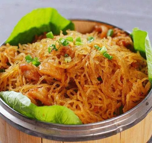 洛寧蒸肉是河南洛寧乃至豫西的傳統(tǒng)名吃之一,由豬肉片、大蔥、粉條、面醬、調(diào)料、面粉等攪拌,籠蒸而成,其底部有一塊圓形面餅是秘制而成,是洛陽特色菜之一。此菜豬肉經(jīng)過蒸制,散發(fā)著撲鼻的香味,而且粉條柔軟滑溜,吸收了豬肉蒸出來的湯料的味道,吃起來爽口鮮嫩,食之香而不膩,余味無窮。在洛寧,只要來了客人,特別是尊貴的遠客,當?shù)厝硕紩o你這道菜,成為洛陽洛寧當?shù)刂难缦??!驹敿殹?br />