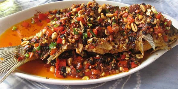 東巴烤魚(yú),又稱納西烤魚(yú),是云南麗江茶馬古道上一道傳統(tǒng)美食,也是麗江納西族代表名菜。納西烤魚(yú)采用特制配方的香料進(jìn)行腌制,以豆豉為主要配料,經(jīng)烤,炸,煎等多道工序精心制作而成,此菜味微辣,口感鮮美,皮焦肉嫩。納西烤魚(yú)一般精選野生草魚(yú)、鯽魚(yú)或鯉魚(yú),宰殺后運(yùn)用獨(dú)特的手藝去除魚(yú)腥,保留了魚(yú)肉特有的鮮嫩并采用獨(dú)門秘方進(jìn)行腌制和烹飪,整條烤魚(yú)外脆內(nèi)嫩,吃起來(lái)味道非常鮮美。東巴烤魚(yú)配合風(fēng)味的豆豉在一起,整個(gè)魚(yú)的風(fēng)味非常香,再加上各種美味的佐料配合在一起,讓人回味無(wú)窮。東巴烤魚(yú)一定是到麗江必吃的一道菜,麗江無(wú)論是小餐館還是