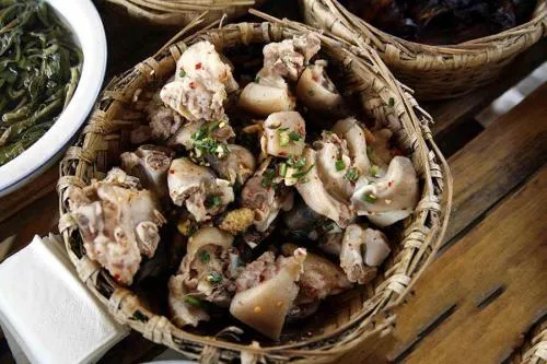 麗江坨坨肉 麗江坨坨肉,因其每坨的重量均在二三兩上下,成坨狀,故名,是麗江彝族人重大喜慶日子常見的桌上菜,是一道彝族的傳統(tǒng)美食,彝語稱“烏色色腳”,也是麗江寧蒗少數(shù)民族大塊吃肉大塊喝酒的傳統(tǒng)菜。這道菜的做法是將剛滿月的小豬宰殺后切塊,腌制,加上寧蒗特有的秘制干腌菜,花椒大鍋煮熟,小豬肉細(xì)嫩柔軟,肥瘦相間,帶有濃濃的花椒香味,卻吃不出麻味來,喝湯時肉香,腌菜特別的酸味,和花椒味道融合在一起。坨坨肉成為了寧蒗飲食的一大特色,是彝族人飲食文化中最具代表性的一道菜。 贊 (0) 39 151 生成海報 東巴烤魚 下一篇 2008-08-08 黑山羊火鍋 上一篇 2008-08-08 相關(guān)推薦