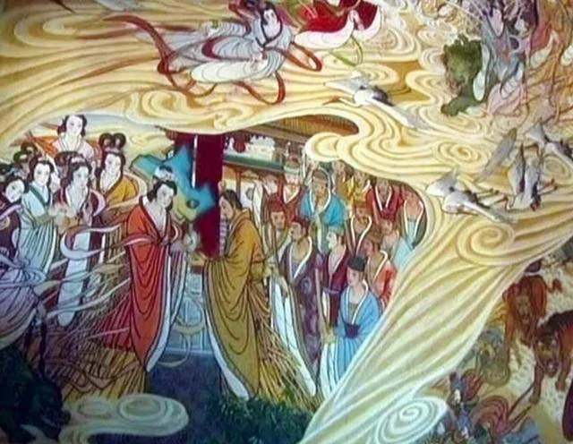 這一路,周穆王在陽紆山遇見水神河伯;在休與山遇見帝臺(tái);在昆侖山參觀了黃帝的宮殿......最后,周穆王來到大地的最西端—崦嵫山。就是在這里,周穆王終于看見了久聞芳名的西王母。周穆王先是獻(xiàn)給西王母一些奇石和絲帶等物。隔了一天,他借用西王母的瑤池,隆重設(shè)宴款待西王母。